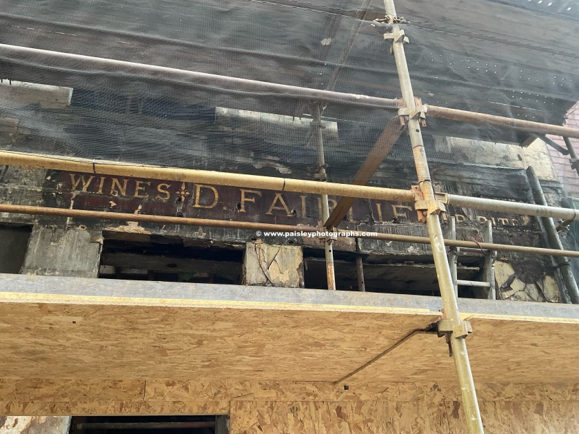Current works at 13 Moss Street at the former Gee Opticians has uncovered the ghost sign of D Fairlie who was a Wines and Spirit dealer, the 1884-1912 Paisley directory and general advertiser shows the shop under ownership of Fairlie, Robert, spirit merchant.