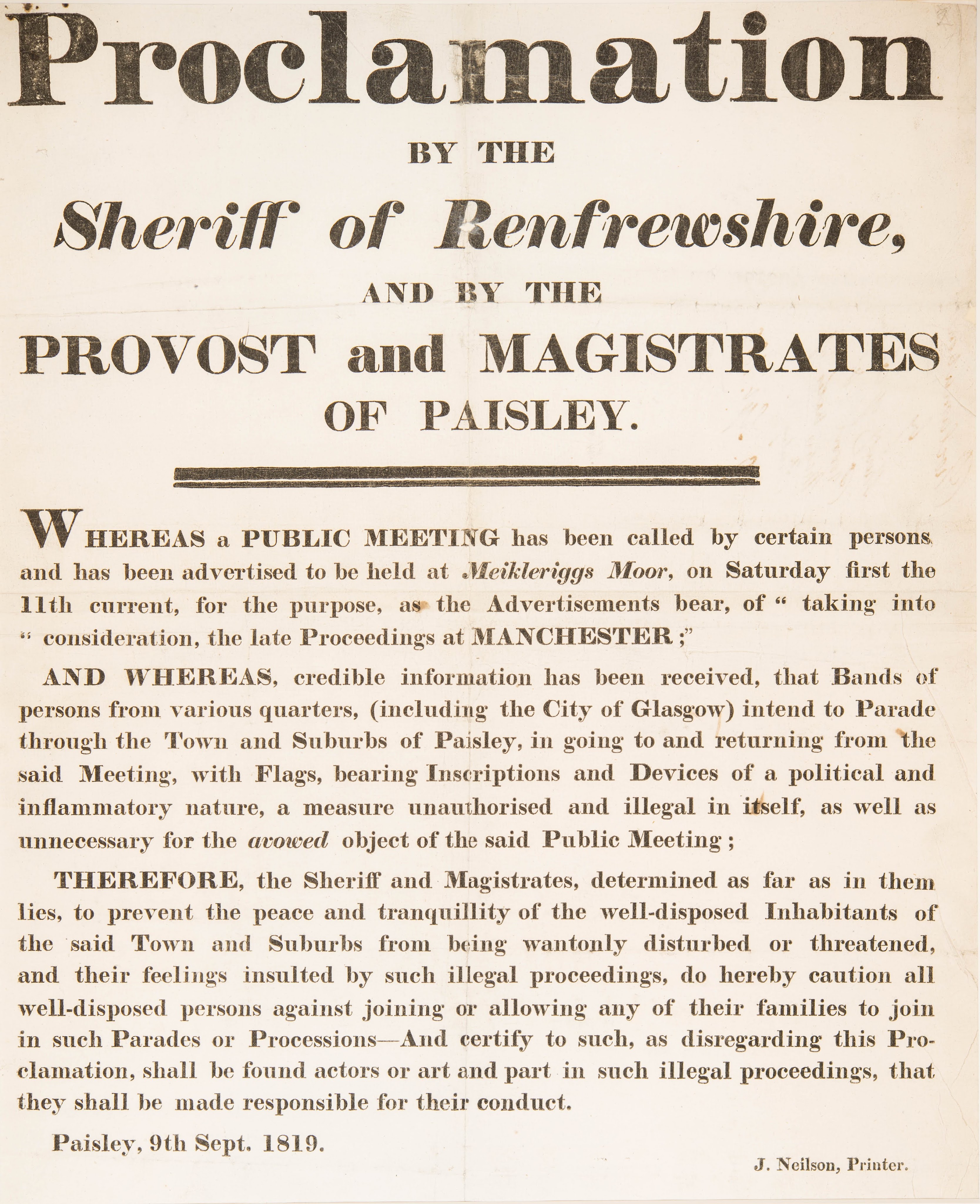 In 1819, following the Peterloo massacre, the radicals staged a rally in support of the victims. Some 20,000 people from across southwest Scotland attended. The local government issued a ban on the display of flags and banners of a political or inflammatory nature – a ban disregarded by those attending.