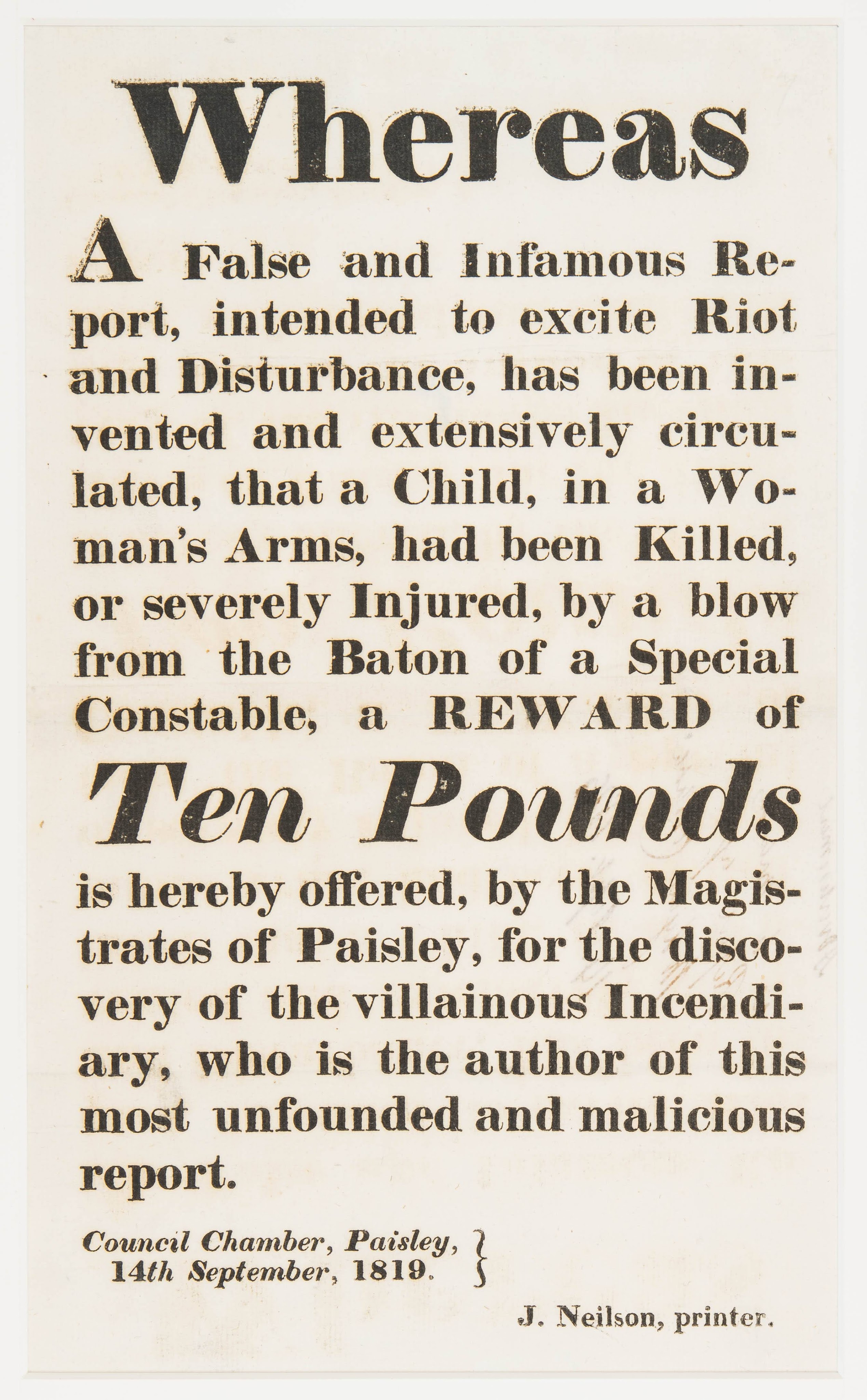 “The Riot Act was read out, but it had no effect on the people of Paisley who refused to disperse and were fighting with the police. The local government sought help from the army and cavalry garrisoned in Glasgow. There were running battles to reclaim and capture streets.”