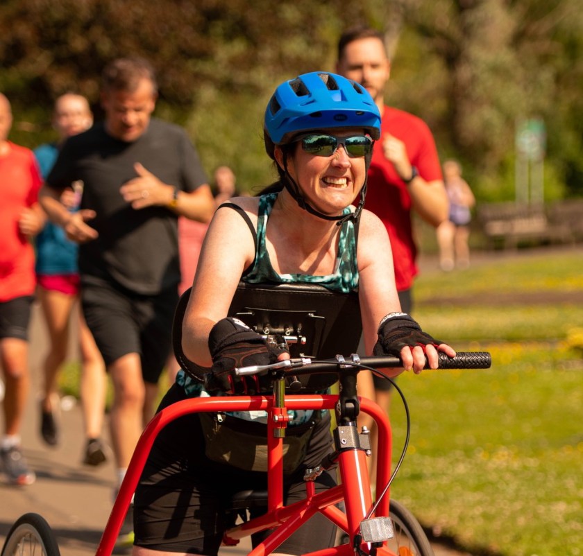 Frame Running which was previously known as Race Running, is an athletic discipline for disabled athletes or ‘racerunners’. Athletes use a running bike, a three-wheeled frame with a saddle, body support and most notably, no pedals – and Julie will use this to take part in the Paisley 10k on Sunday, 20 August.