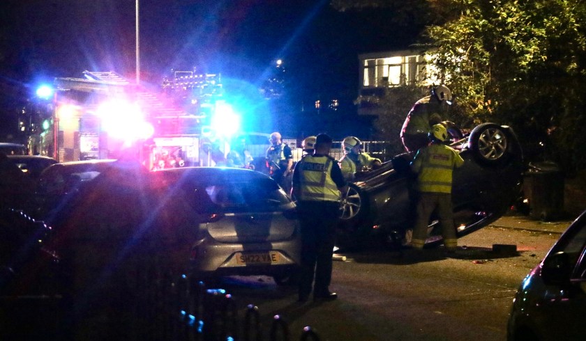 A fleet of emergency services rushed to a Paisley street last night after a car crash that led to one car ending up overturned in the middle of the road.