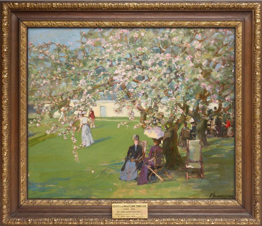 Lawn tennis was, by 1889, approaching the height of its popularity. Invented by Major Clopton Wingfield in 1874, with the unappealing name, ‘Sphairistike’, it quickly replaced croquet as a middle-class pastime when boxed sets of essential equipment went on the market. For the fashion-conscious factory-owners of Paisley, as the present canvas confirms, it provided the ideal theatre for social rivalries. For the artist however, in the midst of a year when time was measured in end-on appointments, dropping into the Paisley Lawn Tennis Club was a moment of delight. One had only to open a little pochade box or erect a lightweight tripod easel for the picture to come to him, unbidden. Lavery would later describe such moments as ones that brought him to ‘concert pitch’. These were times when in an elysian garden of women, the scene composed itself if you were quick enough to grasp its essence. In the present instance, there was no hesitation.