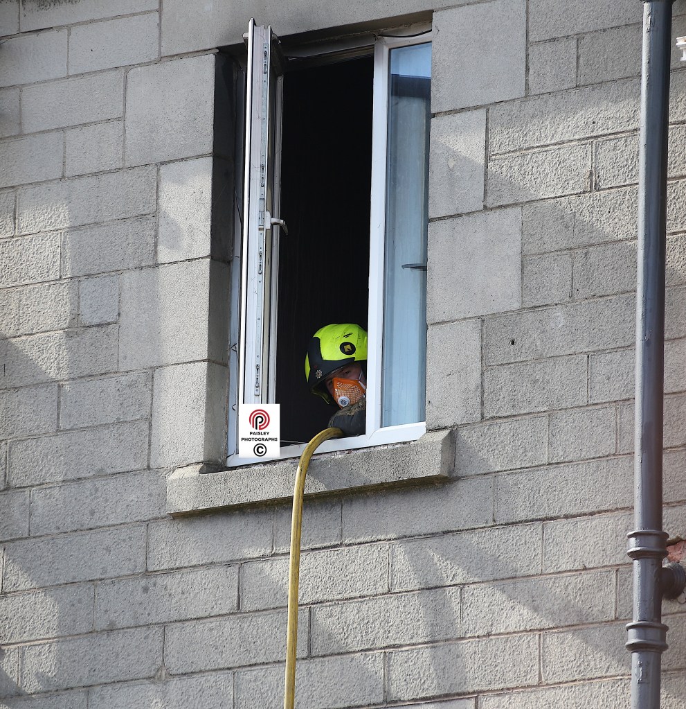 A Johnstone road was closed this afternoon following a fire at a top-floor flat on Macdowall Street.
