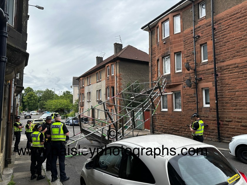 Emergency services rushed to West Street in the West End of Paisley this morning after scaffolding dramatically collapsed into a nearby building — smashing through the living room window of a flat where the occupant was sitting just feet away.