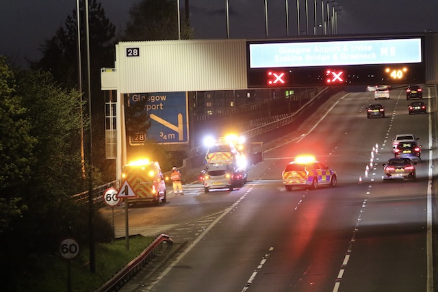 The M8 at Arkleston in Paisley was restricted to one lane last night following a road traffic collision involving a car and a police vehicle.