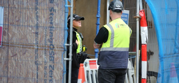 The site is currently under police guard, with officers maintaining a visible presence as forensic teams begin work to determine the nature of the discovery.