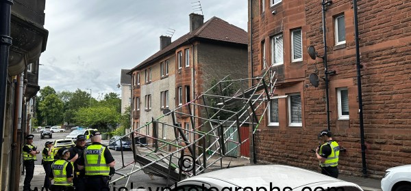 Emergency services rushed to West Street in the West End of Paisley this morning after scaffolding dramatically collapsed into a nearby building — smashing through